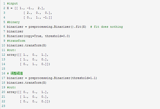 binarize 和 Binarizer 既接受稠密数据(dense array-like),也接受稀疏矩阵(from scipy.sparse)作为输入