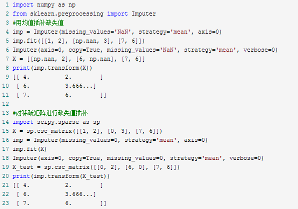 上篇我们讲了五种方法来解决缺失值的问题,其实sklearn里也有一个工具Imputer可以对缺失值进行插补。Imputer类可以对缺失值进行均值插补、中位数插补或者某行/列出现的频率最高的值进行插补,也可以对不同的缺失值进行编码。并且支持稀疏矩阵。