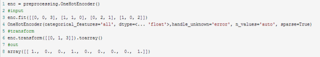 OneHotEncoder参数:class sklearn.preprocessing.OneHotEncoder(n_values='auto', categorical_features='all', dtype=<class 'float'>, sparse=True, handle_unknown='error')