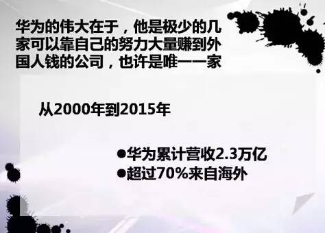 从2000年开始的最近十五年,华为累积营收2.3万亿,超过70%来自海外,在外国人身上赚的钱达1.38万亿!