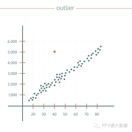 离群值是那些数值超出了正常数值范围的数据。我们知道图表常常可以帮助识别数据模式,在右边的例子中,x轴上的数量越大,在y轴上数量就越大,这就是一种数据模式。有时候有些特殊的数据不符合图表中数据模式,如图中橙色点,它们就是离群值。