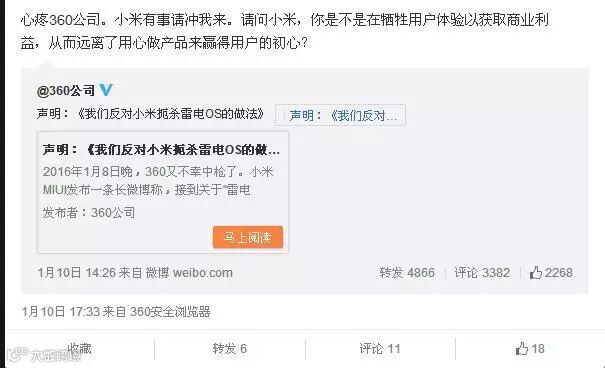 昨天下午14点,被小米封杀的360终于发声,其发微博鼎力支持"雷电OS",称因为“雷电OS”比MIUI轻巧、省电、快速、无预装软件,小米才心生杀机。随后,“雷电OS”转发360微博,并称“心疼360公司。小米有事冲我来”,颇有些你侬我侬的意味。