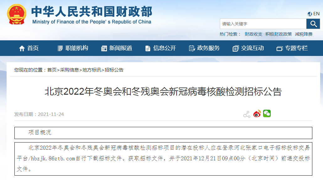 项目名称:北京2022年冬奥会和冬残奥会新冠病毒核酸检测