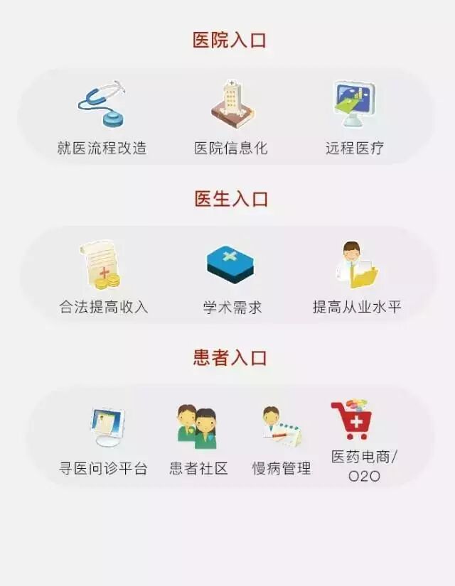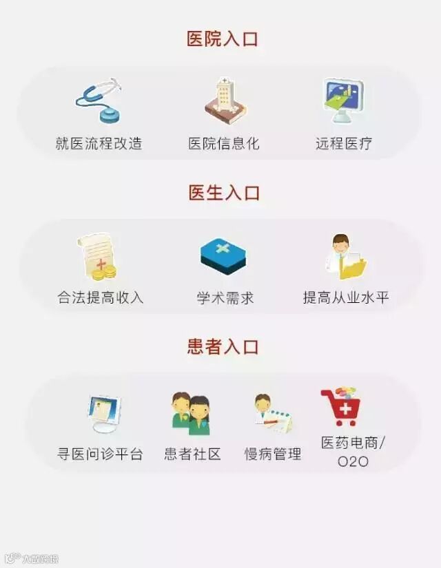 医院入口:部分企业以挂号为最早入口,已经在医疗信息化和流程改造上面取得了一定的成绩。这个领域关注的重点是接入优质医院的数量和与医院信息系统的对接程度。