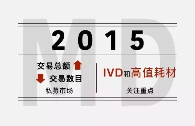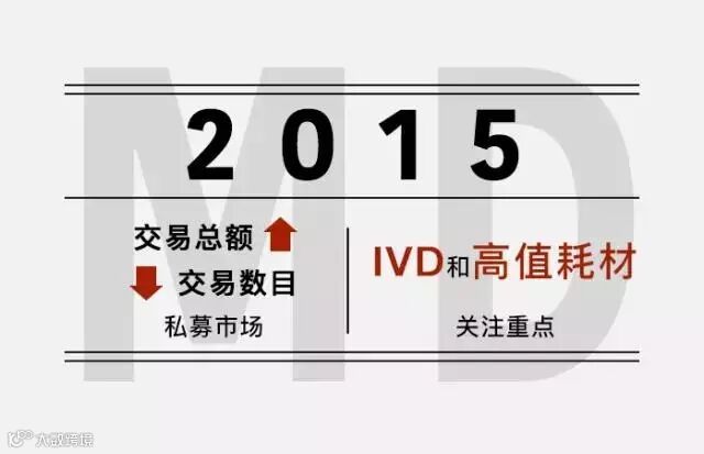 医疗器械领域:2015年前11月私募市场相比2014年呈现交易总额上升,交易数目下降趋势。主要是由于境内投资热度下降,境外投资热度上升并出现了大额境外融资。IVD和高值耗材成为投资者的关注重点。