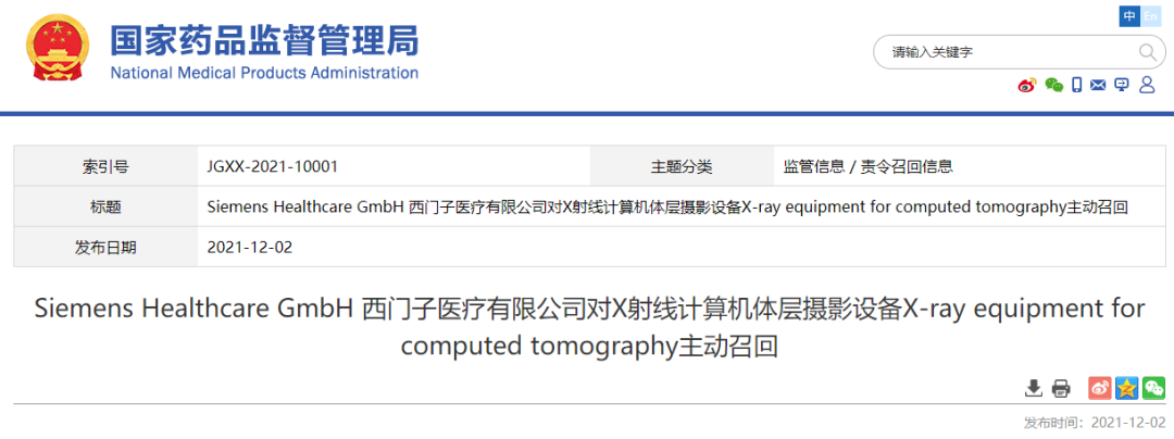 西门子医疗系统有限公司报告,由于涉及特定型号、特定批次产品,存在使用特定版本进行头部扫描时,图像质量有降低的潜在风险的问题,生产商Siemens Healthcare GmbH 西门子医疗有限公司对X射线计算机体层摄影设备X-ray equipment for computed tomography(注册证号:国械注进20183060438、20173301120、20173061125、20173301122、20173301126、20173301123)主动召回。召回级别为二级。涉及产品的型号、规格及批次等详细信息见《医疗器械召回事件报告表》。