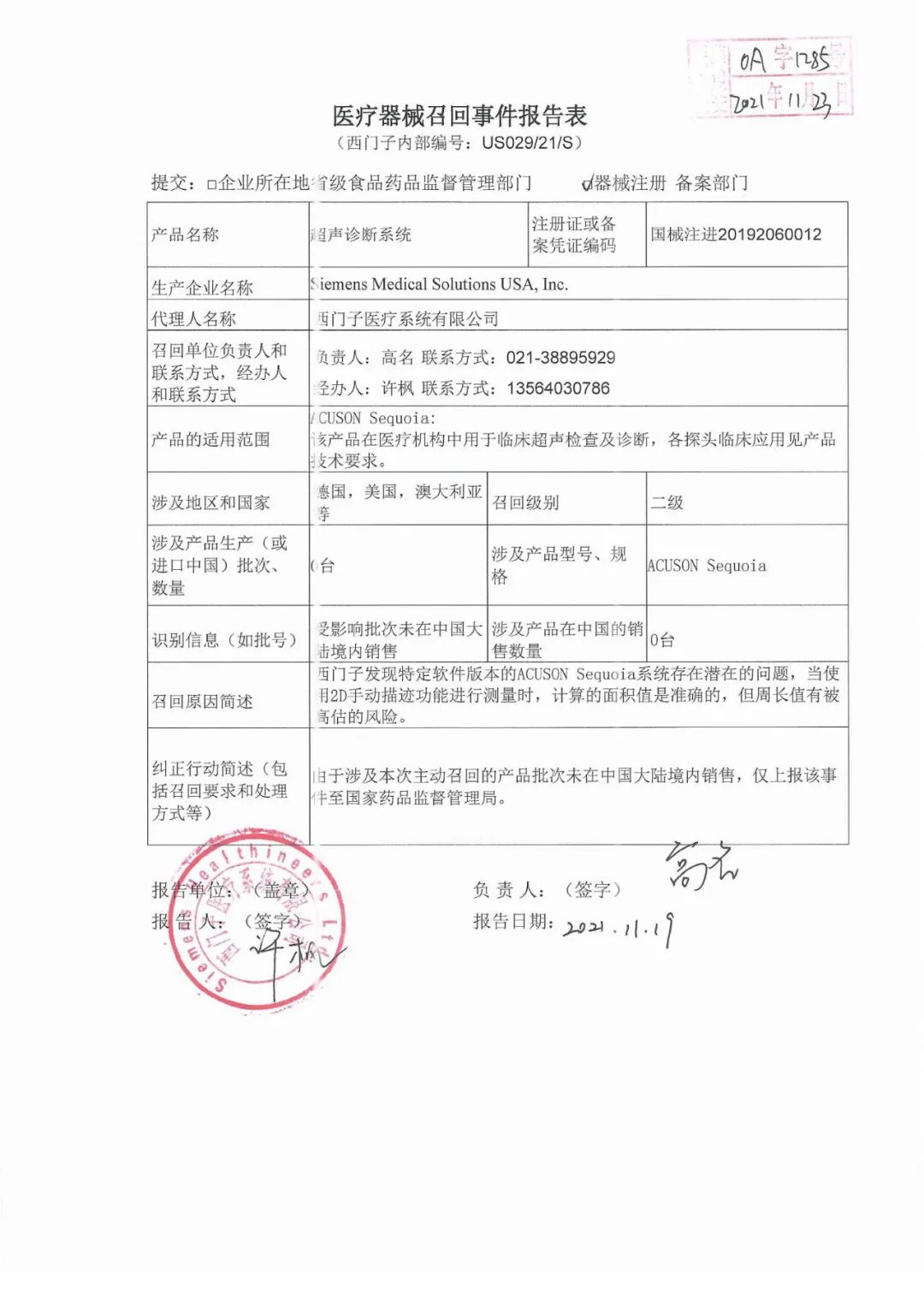 西门子医疗系统有限公司报告,由于涉及特定型号、特定批次产品,存在软件版本为ACUSON Sequoia系统存在当使用2D手动描迹功能进行测量时,计算的面积值是准确的,但周长值有被高估的风险的问题,生产商美国西门子医疗系统股份有限公司Siemens Medical Solutions USA, Inc.对超声诊断系统Diagnostic Ultrasound System(注册证号:国械注进20192060012)主动召回。召回级别为二级。涉及产品的型号、规格及批次等详细信息见《医疗器械召回事件报告表》。