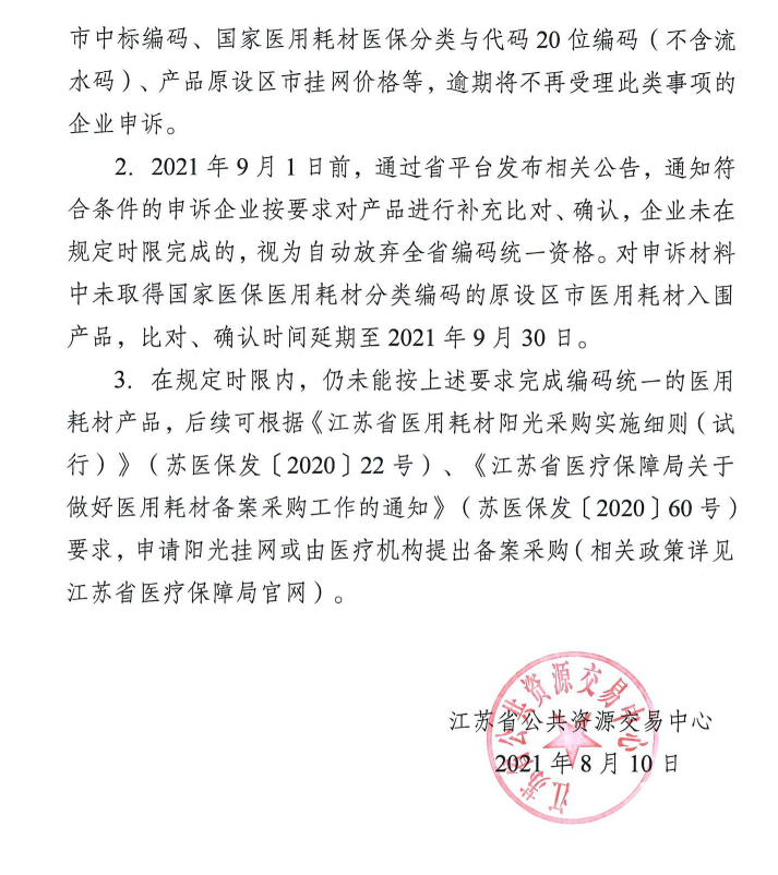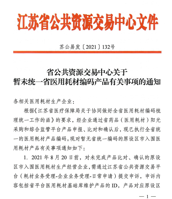 现江苏省要求对暂无省统一编码的原设区市入围医用耗材产品,开通提交申诉窗口,符合条件的企业可按照要求重新对产品进行补充比对、确认,从而确保符合挂网采购的要求。