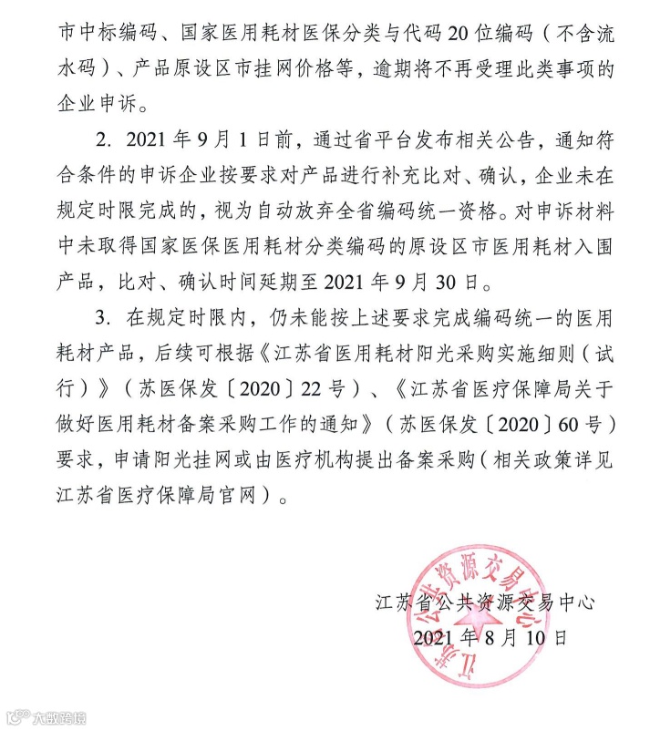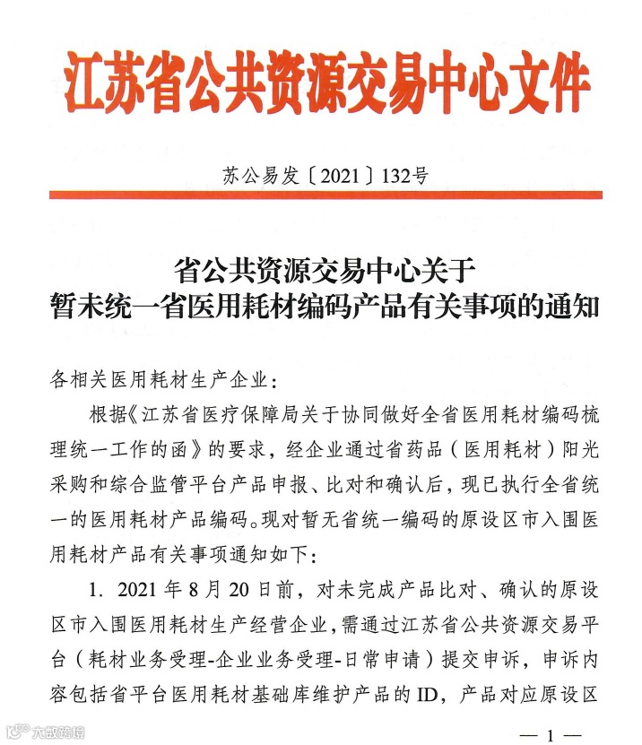 根据“通知”了解,根据《江苏省医疗保障局关于协同做好全省医用耗材编码梳理统一工作的函》的要求,经企业通过省药品(医用耗材)阳光采购和综合监管平台产品申报、比对和确认后,现已执行全省统一的医用耗材产品编码。