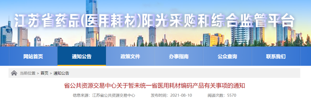 8月10日,江苏省公共资源交易中心发布了《省公共资源交易中心关于暂未统一省医用耗材编码产品有关事项的通知》(以下简称“通知”),10月1日后,又有一批耗材企业,或将被暂停挂网采购!