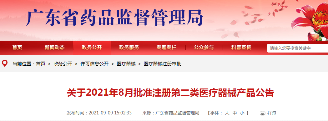 9月9日,广东省药监局发布了一则关于2021年8月批准注册第二类医疗器械产品公告。