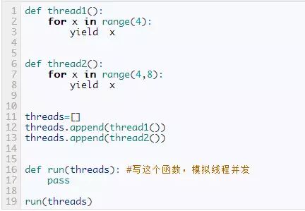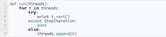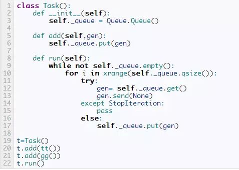 如果仅仅是实现上面的效果,其实很简单,我们可以自己写一个。主要思路就是将生成器对象放入队列,执行send(None)后,如果没有抛出StopIteration,将该生成器对象再加入队列。