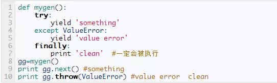 调用gg.next很明显此时输出‘something’,并在yield ‘something’暂停,此时向gg发送ValueError异常,恢复执行环境,except 将会捕捉,并输出信息。