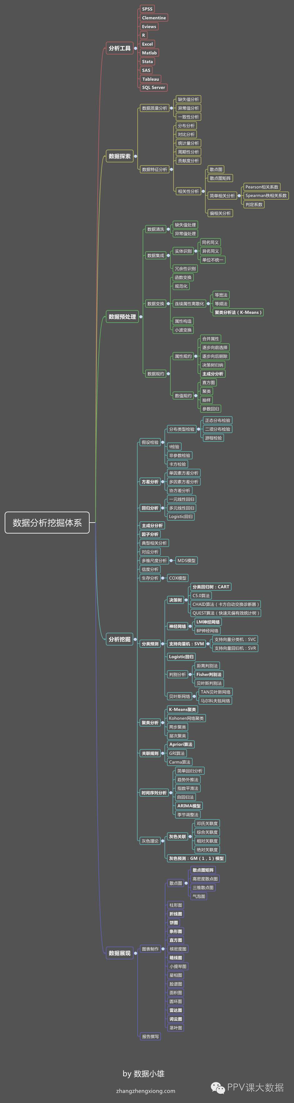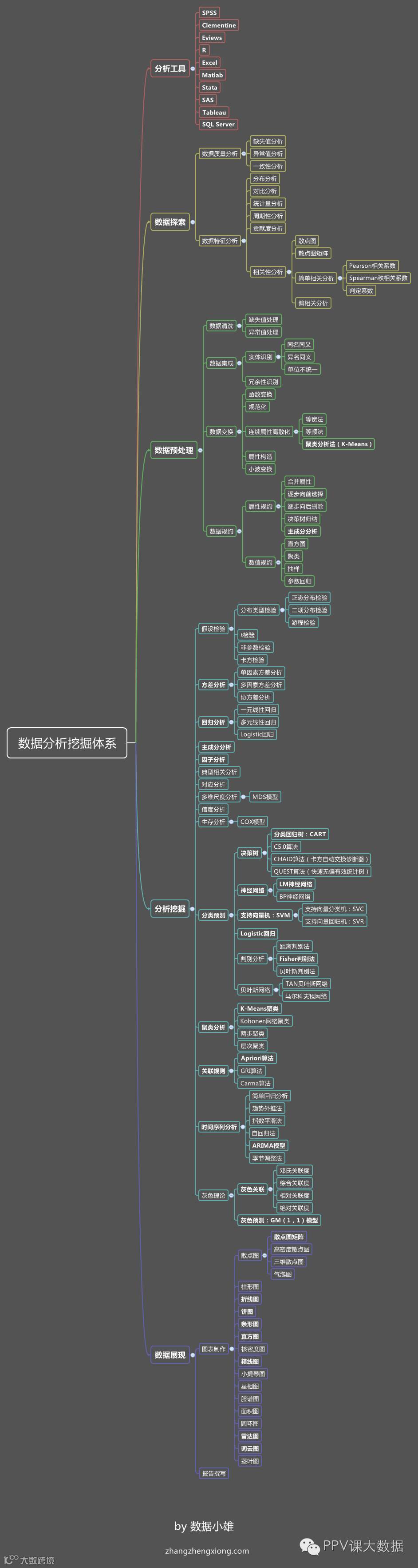 不久前,在网上看到一张数据挖掘的知识谱系图,顿时觉得眼前一亮,以前零零碎碎的学习数据挖掘,东一块西一块,没有任何系统性,知识间的关联也没有底,但是这幅图分门别类的归纳了各个知识点,让我头脑中的知识脉络马上清晰了,这里也分享这张图给大家,也非常感谢这张图的作者的劳动.图中列出了很多知识点,但是对于像我这样的初学者来说,很多知识点我们并不清楚,也没有学过,而且已经踏入职场,或者在校也没有开设此类课程,所以,总感觉学起来无从下手,于是,本着互联网共享的精神,我花费了一段时间导出搜集知识,将每个知识点进行了说明,并整理了许多学校资源,当然,由于能力有限,有更高的资源可能没有发现,或者知识点讲解的不是那么清楚,欢迎各位拍砖.互相交流学习.知识点说明请继续阅读下篇.数据挖掘知识脉络与资源整理(二)