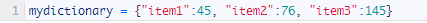 每个键/值用冒号分开,前面是键后面是值。在第一个元素中,item1是键,45是值。同时注意我们用大括号来包住元素。