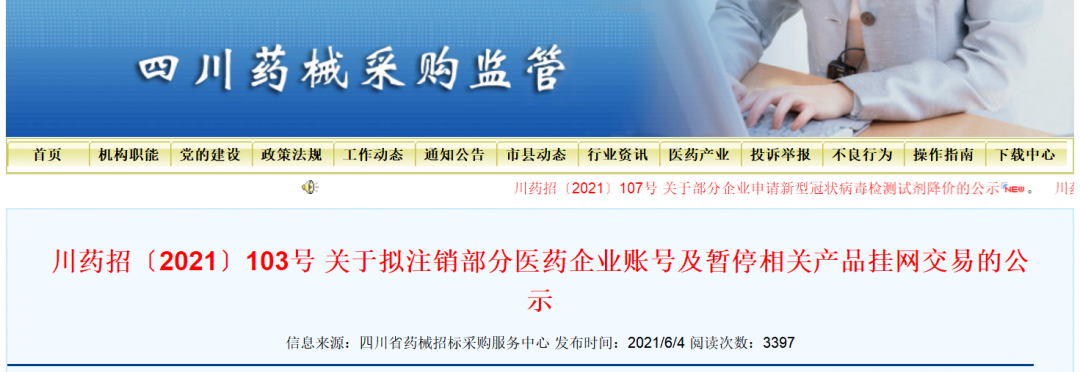 近日,四川药械采购监管官方网站发布了《川药招〔2021〕103号 关于拟注销部分医药企业账号及暂停相关产品挂网交易的公示》,