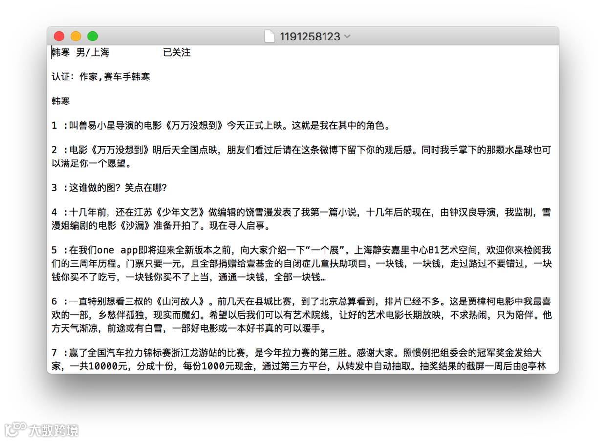 文字内容保存到以%user_id命名文本文件中,所有高清原图保存在weibo_image文件夹中