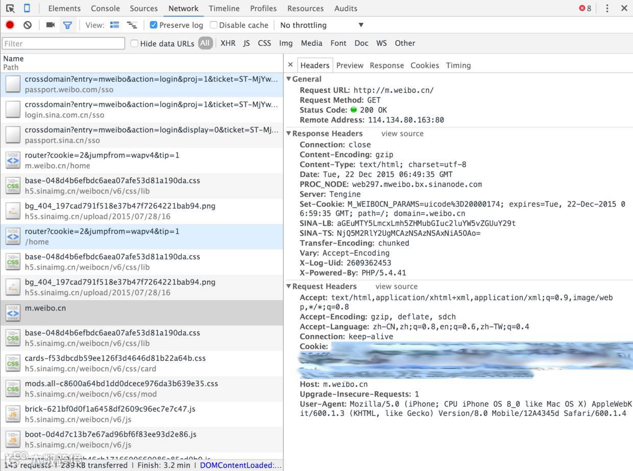 找到m.weibo.cn->Headers->Cookie,把cookie复制到代码中的#your cookie处