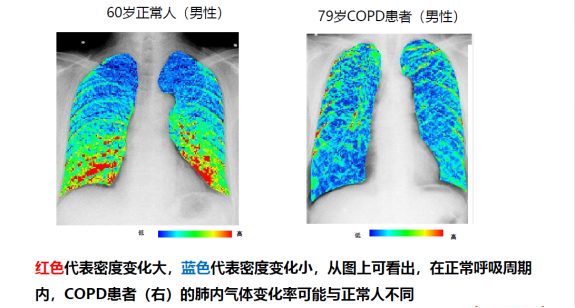 目前,基于动态数字化X线摄影技术,已经在胸部运功功能成像,诸如COPD、哮喘、颈椎病等相关疾病的应用中发挥出独特的临床诊断价值。以COPD为例,通过对COPD患者的呼吸肺野面积的变化与正常呼吸肺野面积气体变化率的数据比较,可以比较精准地评估COPD患者的肺部运功功能状态。