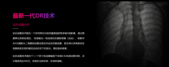 动态DR作为X线摄影技术,在临床中具备广泛的应用价值与优势。举例来说,动态DR在胸部影像诊断中具有可视化功能,可在任意转动体位时,结合呼吸运动,排除胸部骨骼、心影和肺门大血管重叠或遮盖。多角度地动态观察胸廓、肋骨、纵膈、心影、膈肌,以及胸腔病变、肺部病变、纵膈病变在呼吸运动状态下的变化,在各种管路位置的提示及治疗效果评估上也能满足临床需要。