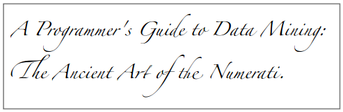 2010年6月,我曾尝试给这本书起一个合适的标题。我喜欢有趣的标题,但很可惜我不太擅长起名字。近期,我发表了篇关于数据挖掘的论文,名为《扎入文字堆:阿拉伯文字的地域化分类》。我喜欢这个标题,不过我得承认这是我的太太帮我取的。我曾和马克肖恩合著了一篇论文,名为《情绪与模式:从理论到争辩》,这个标题也是我的搭档取的。总之,六月时我取的那些标题很难一眼看出这本书讲的是什么,所以我最后用了《面向程序员的数据挖掘指南》作为标题的一部分,因为这个标题和本书的内容非常契合——这本书是提供给正在从事编程工作的人员阅读的。也许你会疑惑子标题究竟是什么意思: