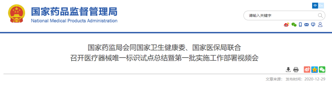 12月28日,国家药监局会同国家卫生健康委、国家医保局,联合召开了医疗器械唯一标识试点总结暨第一批实施工作部署视频会议。