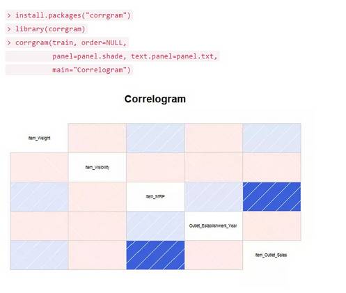 使用类型: 相关图是用来测试数据集的可用变量间的关联程度。创建一个相关图,我们用corrgram package代替ggplot。我意识到用专业软件包创建相关图比ggplot容易多了。