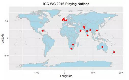 让我们绘制一个参加2016年的ICC世界杯T20的国家。经过研究,我发现今年有16个国家参加。让我们来看看这些国家在世界地图上的位置。