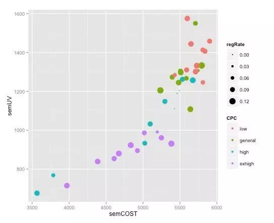 如图,点的大小是注册转化率,点的颜色是单位点击成本,从暖色调到冷色调,由低到高。转化率高且cpc低的点,在右上角。我们可以说,sem投放成本越高,sem流量越多,且转化率越高,更可喜的是cpc还更低。对于一个sem投放部门来说,没有比这更完美的结论了。