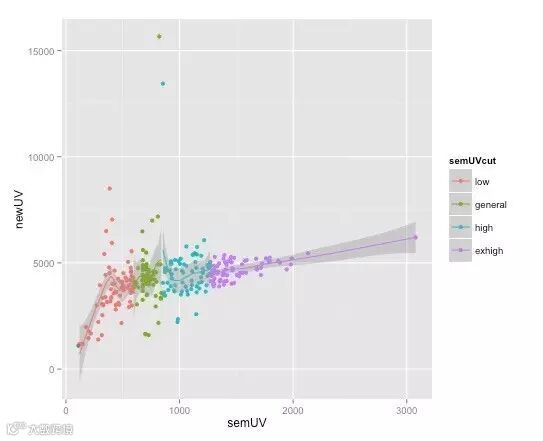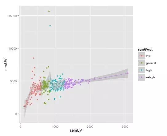 图中,我将sem来源的访问量按四分位数进行了分层,配合局部加权多项式拟合线。似乎又有了新的收获: