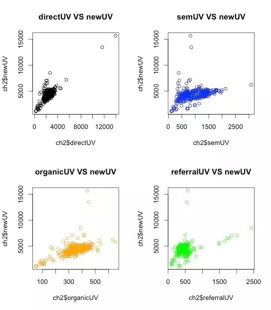 上图展示了某公司主站的新访客各来源渠道与总新访客量。结论很直观:direct(直接访问来源)和organic(自然搜索来源)和总的新访客有明显的正相关关系(direct与newuv相关系数达到0.89,direct来源的占比达到60%)。因此,我们知道这个公司大部分访客来源于口碑,而且其潜力还相当大,因为direct和organic图显示新访客对direct的弹性比较高,没有出现像sem(蓝色)图那样的边际效益递减的情况。
