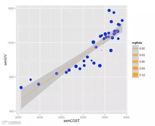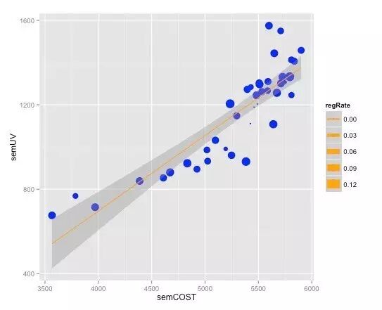 气泡图,就是除了横纵坐标轴,点的大小还能衡量一个变量的散点图。上图不仅衡量了sem投放总成本(semCOST)和sem来源流量(semUV),还用点的大小衡量注册转化率(regRate)。结论比较直观,注册转化率高的点,在右上方,且预测线显示,投放力度越大,流量越大,且注册转化率至少不变。