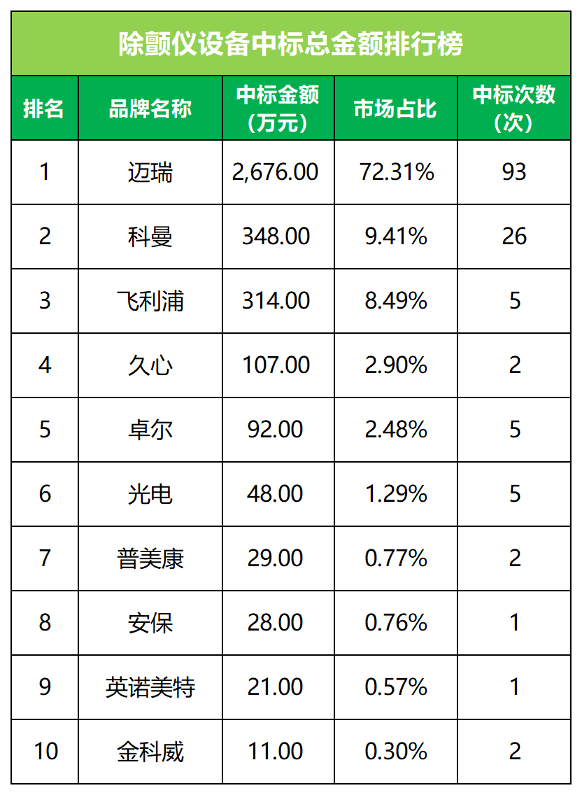 通过测算2019年至2021年体外除颤设备的市场规模,我们假设未来AED配置保持稳定增长,预测2025年我国体外除颤设备市场规模将达到56.08亿元。经测算,2021年我国体外除颤设备领域CR4为90.63%,其中迈瑞医疗以72.31%排名第一。