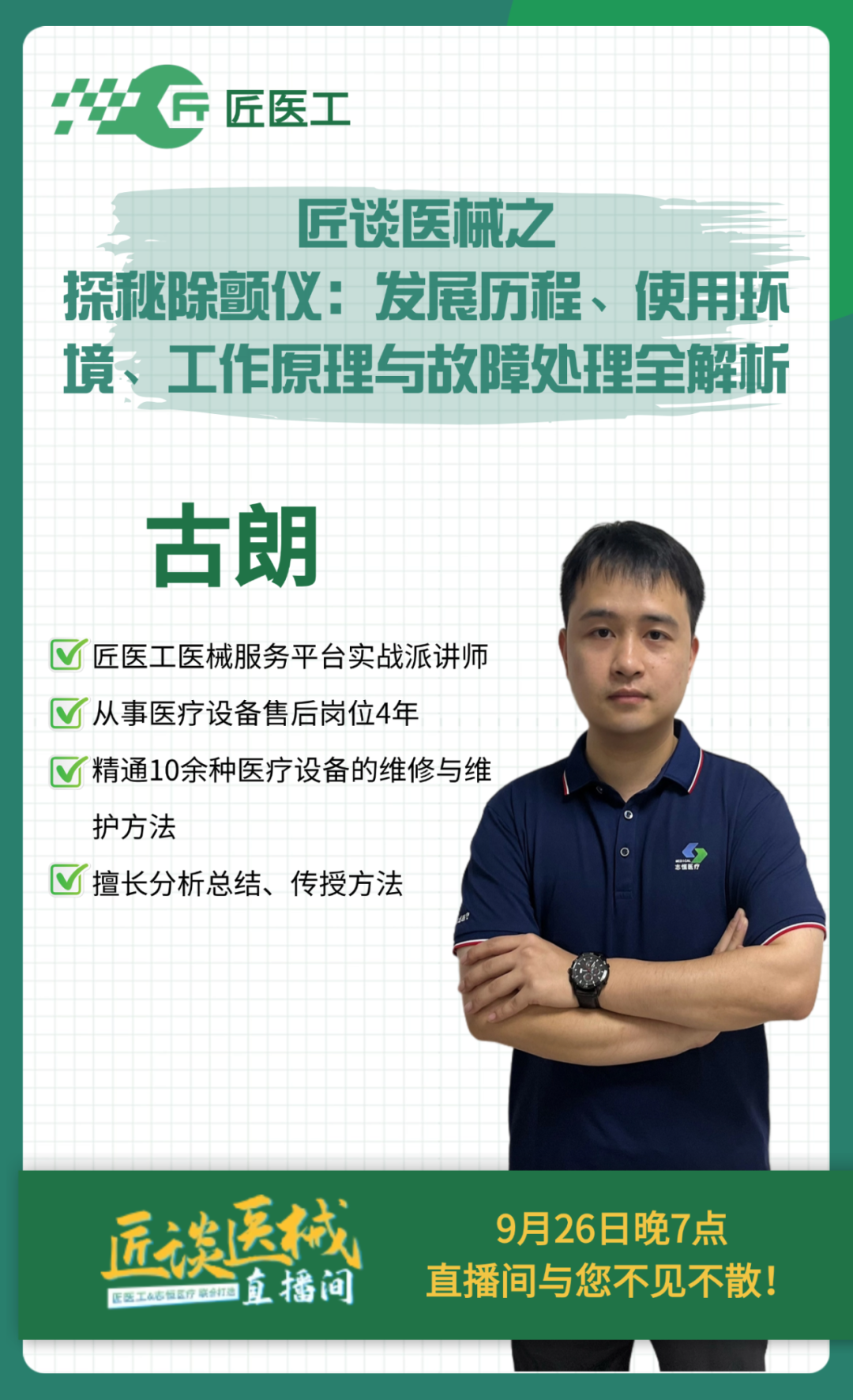我们匠医工非常荣幸地邀请到了在除颤仪设备专业工程师——古朗老师,作为本次直播分析的特邀嘉宾。他拥有长达4年的医疗设备维修经验,精通10余种医疗设备的维修与维护方法,如:血透机、呼吸机、牙椅、全自动发药机、电子内镜主机、除颤仪、监护仪等。并且他个人亲身教学、共带领过9名工程师从入行小白到行业老手,传授经验时以“思路”为主,擅长分析总结、将方法教给学员。