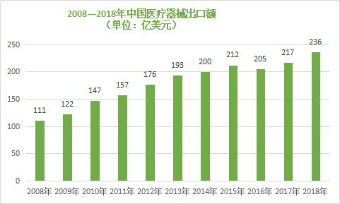 同时,国产医疗器械在推进国内市场进口替代的进程中,也在积极走向海外市场。从出口额来看,中国医疗器械出口额从 2008 年的 111 亿美元提升至 2018 年的 236 亿美元,复 合增速达到约 8%。中国医疗器械在全球已占一席之地。