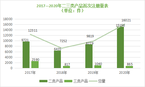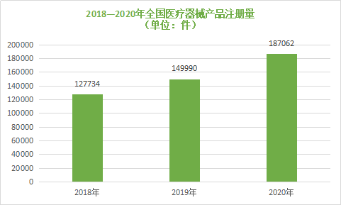 在医疗器械产品方面,截至2020 年底,全国有效产品注册量达187062 件,同比增长24.7%;其中,二类产品首次注册量为15156件,三类产品首次注册量为865件。