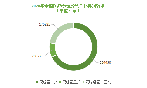 到2020年底, 经营企业数量共计788 097家,同比增长29.39%。其中,仅经营二类医疗器械产品的企业534450家,仅经营三类医疗器械产品的企业76822 家,同时经营二类、三类医疗器械产品的企业176825家。