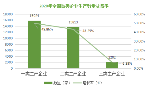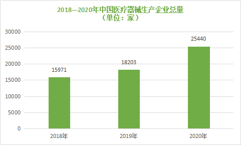 到2020 年底,中国医疗器械生产企业达25440家,同比增长39.76%。其中,可生产一类产品的企业有15924家,占比49.86%;可生产二类产品的企业13813家,占比43.25% ;可生产Ⅲ类产品的企业2202家,占比6.89%。