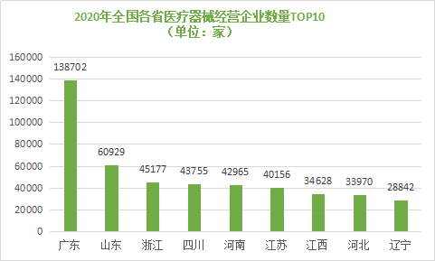 从全国各省份经营企业分布状况来看,广东省以1387702家经营企业高举榜首,山东凭借60929家经营企业位居第二,浙江省以45177家经营企业排名第三,四川省、河南省、江苏省等省份进入全国前十排名榜。沿海省域在医疗器械经营中占据相对优势,四川、河南、江西等内陆省份成为医疗器械产业转移、升级的重要区域。
