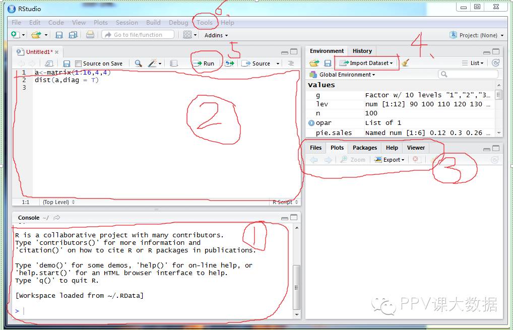 先看看记号1,这里是软件的控制台,也就是命令显示和执行结果的地方,我们可以直接在这里输入命令,敲击回车键便可以执行.记号2,则是脚本输入界面,这里可以写上脚本,同时也可以黏贴其他地方的脚本,在这里写的命令我们可以敲击Ctrl加Enter执行命令,也可以鼠标点击5,执行.界面的3处是一个多功能台,依次是file,可以打开本地文件,plot则是显示图形结果的地方,packages则可以显示当前下载和加载的包,在这里可以搜素,勾选你要加载的包,这样免除命令行操作,也是非常方便的.后面的help顾名思义则是显示帮助文档的地方,另外6,工具栏这里包括包的安装.所以总结到这里安装包是有三种途径的,非常的方便.