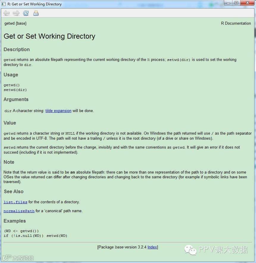 再来实践一下,还记得刚才看到的怎么打开帮助文档吗? 这里我们就以刚才学的函数setwd (" ") 为例学习怎么看帮助文档找到我们需要的信息,现在你都知道setwd是干什么用的,下面便是它的帮助文档,
