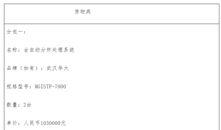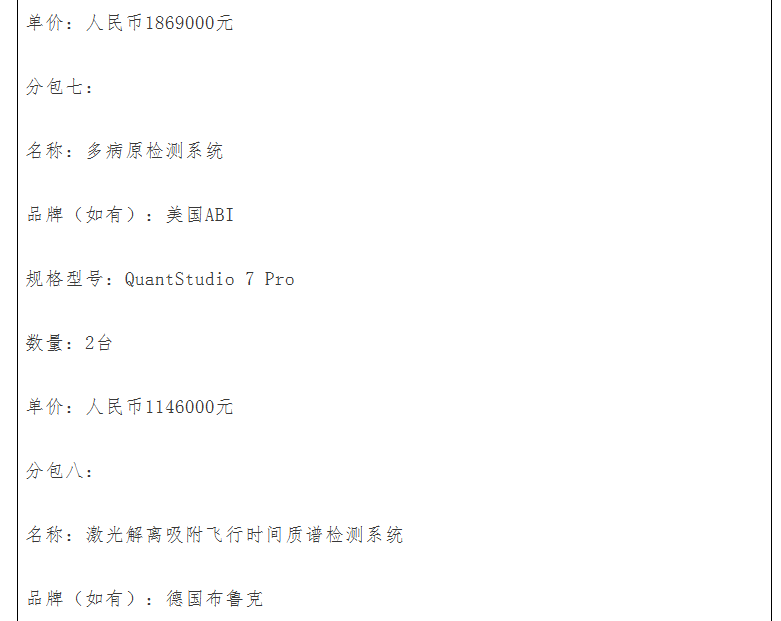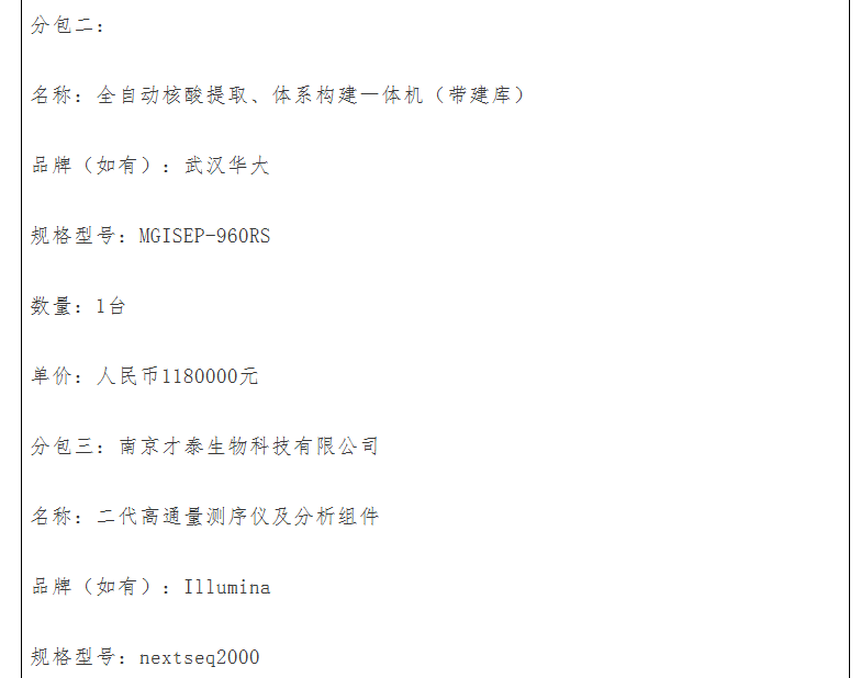 据悉,此次公开招标的货物分别为包1全自动分杯处理系统、包2全自动核酸提取、体系构建一体机(带建库)、包3二代高通量测序仪及分析软件、包4全自动核酸蛋白分析系统、包5全自动核酸提取、体系构建一体机(不带建库)、包6三代高通量测序仪及分析组件、建库仪、包7多病原检测系统、包8激光解离吸附飞行时间质谱检测系统。