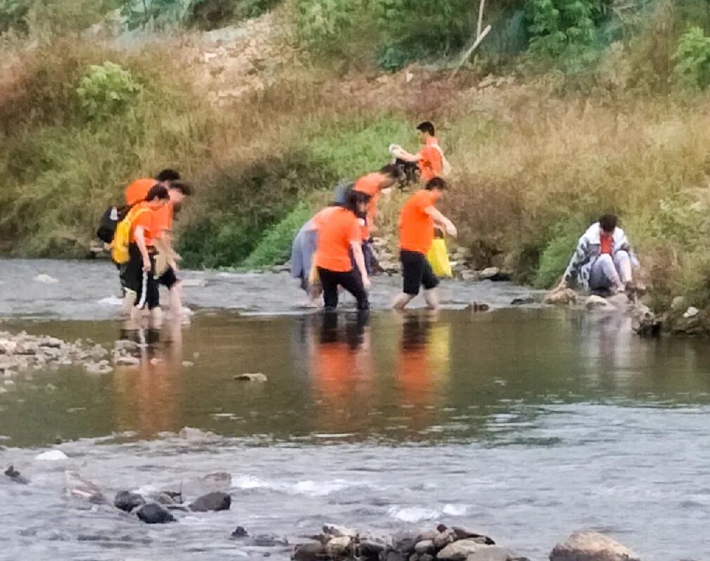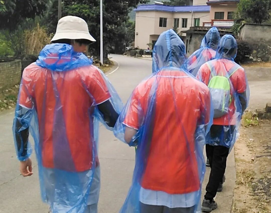 即使路途遥远,道路崎岖,途中下起了小雨,行进很累、很苦。但是没有人愿意放弃,大家相互鼓励,相互扶持,一步一步,每一个足迹都写满了坚毅,每一滴汗水都体现着活力。