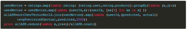 这里结果与我们前面取k=2000的结果相同,说明我们的计算和MLlib是一致的,但是K=10或者比较小的值时,不一样,这是因为MLlib在precisionAt(k)这个函数与我们前面逻辑不同,这里我们不做考虑。