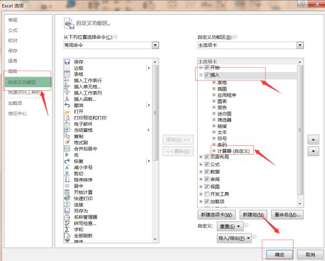 有的excel用户不习惯使用excel的计算功能,这是可以调取excel中的计算器,点击文件>选项>自定义功能区>所有命令>计算器,右侧在插入选项下面新建组,将计算器添加到插入选项下,重启excel,即可使用计算器功能。