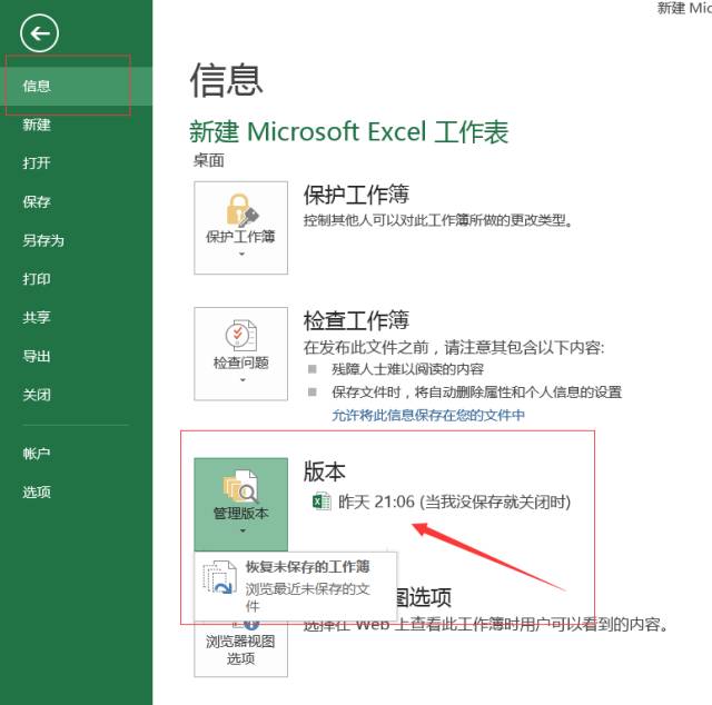 方法二: 打开excel,点击文件>信息>管理版本>恢复未保存的工作簿。