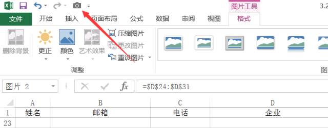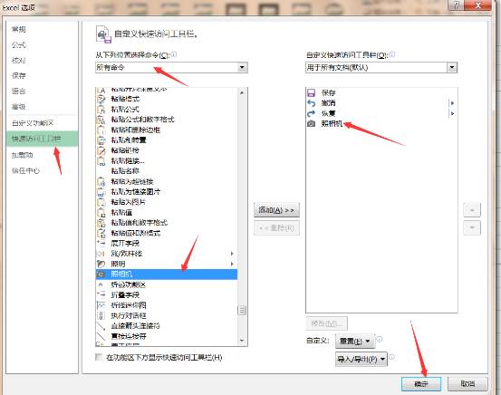 打开excel,点击 文件>选项>快速访问工具栏,所有命令下的照相机,点击确认。