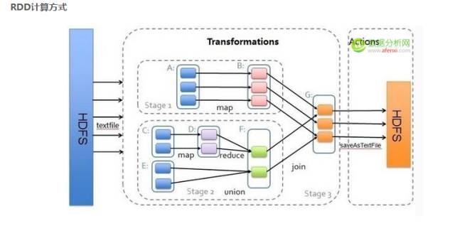它们本质区别是:Transformation返回值还是一个RDD。它使用了链式调用的设计模式,对一个RDD进行计算后,变换成另外一个RDD,然后这个RDD又可以进行另外一次转换。这个过程是分布式的。Action返回值不是一个RDD。它要么是一个Scala的普通集合,要么是一个值,要么是空,最终或返回到Driver程序,或把RDD写入到文件系统中。关于这两个动作,在Spark开发指南中会有就进一步的详细介绍,它们是基于Spark开发的核心。这里将Spark的官方ppt中的一张图略作改造,阐明一下两种动作的区别。