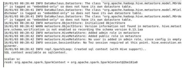 2、驱动器程序通过一个SparkContext对象来访问spark,这个对象代表对计算集群的一个连接。(比如在sparkshell启动时已经自动创建了一个SparkContext对象,是一个叫做SC的变量。(下图,查看变量sc)