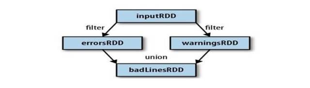 3、Spark会使用谱系图来记录这些不同RDD之间的依赖关系,Spark需要用这些信息来按需计算每个RDD,也可以依靠谱系图在持久化的RDD丢失部分数据时用来恢复所丢失的数据。(如下图,过滤errorsRDD与warningsRDD,最终调用union()函数)